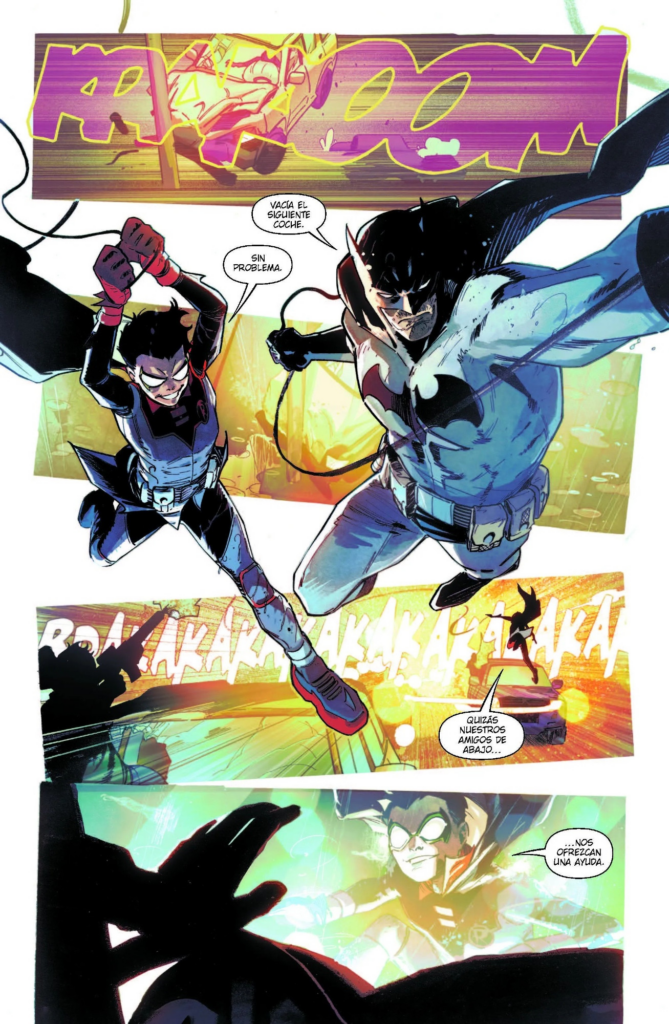 Debería serlo siempre pero a veces pesa más una cosa que otra. Aquí se complementa a la perfección tanto con Javi Fernández como con Miguel Mendonca, que están soberbios. Sin embargo creo que hay que destacar otro autor que brilla especialmente y es el colorista Marcelo Maiolo. Los cómics de Batman transcurren de noche y suelen tener grandes contrastes con sombras muy pronunciadas. Esto también sucede pero tiene algo muy interesante y es el resplandor de la luz eléctríca de la ciudad durante la noche. Así, ese resplandor cambia la dirección de las sombras e incluso las hace menos oscuras, dando una nueva imagen. Queda realmente bien.
